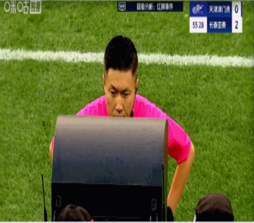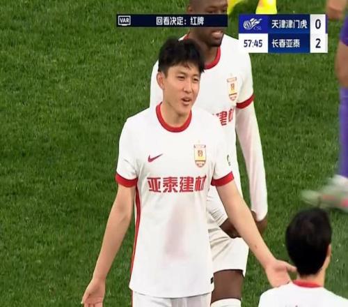 第58分钟,王禹踢中了哈达斯脚踝,VAR介入,裁判回看之后取消黄牌,改判红牌。亚泰少打一人!
