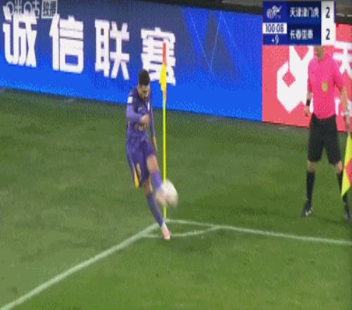 第90+10分钟,津门虎最后时刻角球进攻,谢维军推射空门得手,津门虎绝平2-2亚泰!谢伟军是梅州客家人,这个进球也帮助了家乡球队。