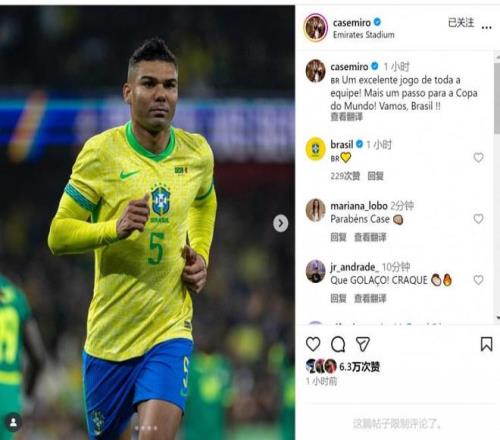 卡塞米罗社媒晒出比赛照片,写道:“全队都表现出色,向世界杯又迈进一步!加油巴西!”